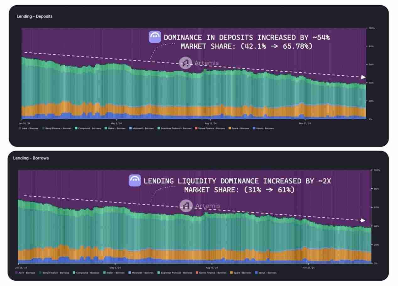 借贷领域,Aave自2024年以来持续巩固其主导地位,存款和借款市场份额均大幅提升。尽管Aave的收益率并非最高,但其良好的声誉和用户信任度使其成为首选平台。