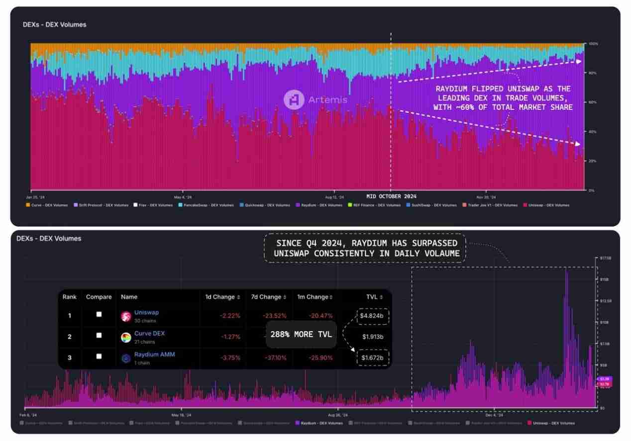 2024年第四季度,基于Solana的去中心化交易所(DEX)Raydium占据约61%的市场份额,超越Uniswap成为行业领导者,尽管其总锁仓价值(TVL)仅为Uniswap的39%。Raydium的崛起可能与Solana生态的Meme币热潮有关,但其长期用户活跃度(LT)仍有待观察。
