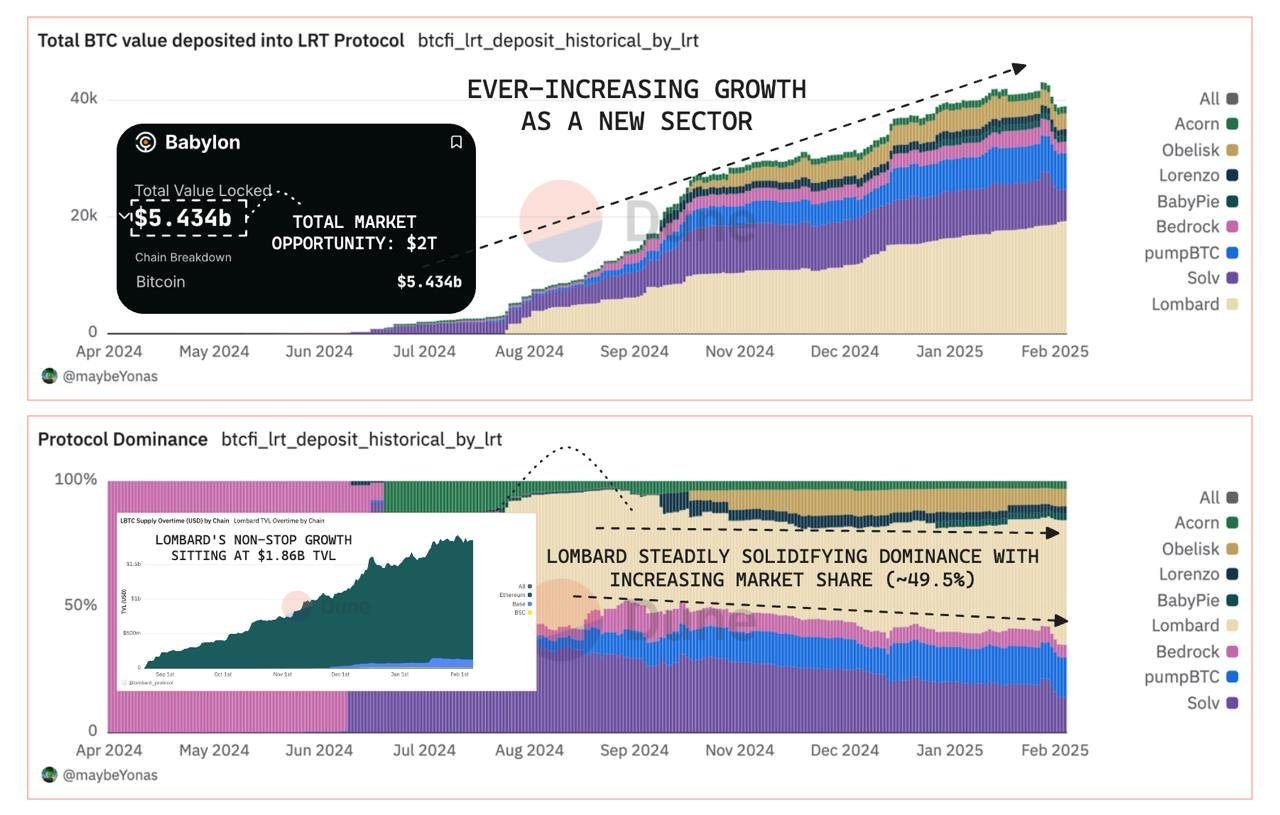 BTC-Fi领域,Lombard的市场份额稳步上升至49.5%。随着Babylon的成熟,对BTC的需求将增长,Lombard作为DeFi中集成度最高、使用最广泛的BTC流动性再质押方案,有望占据行业主导地位。