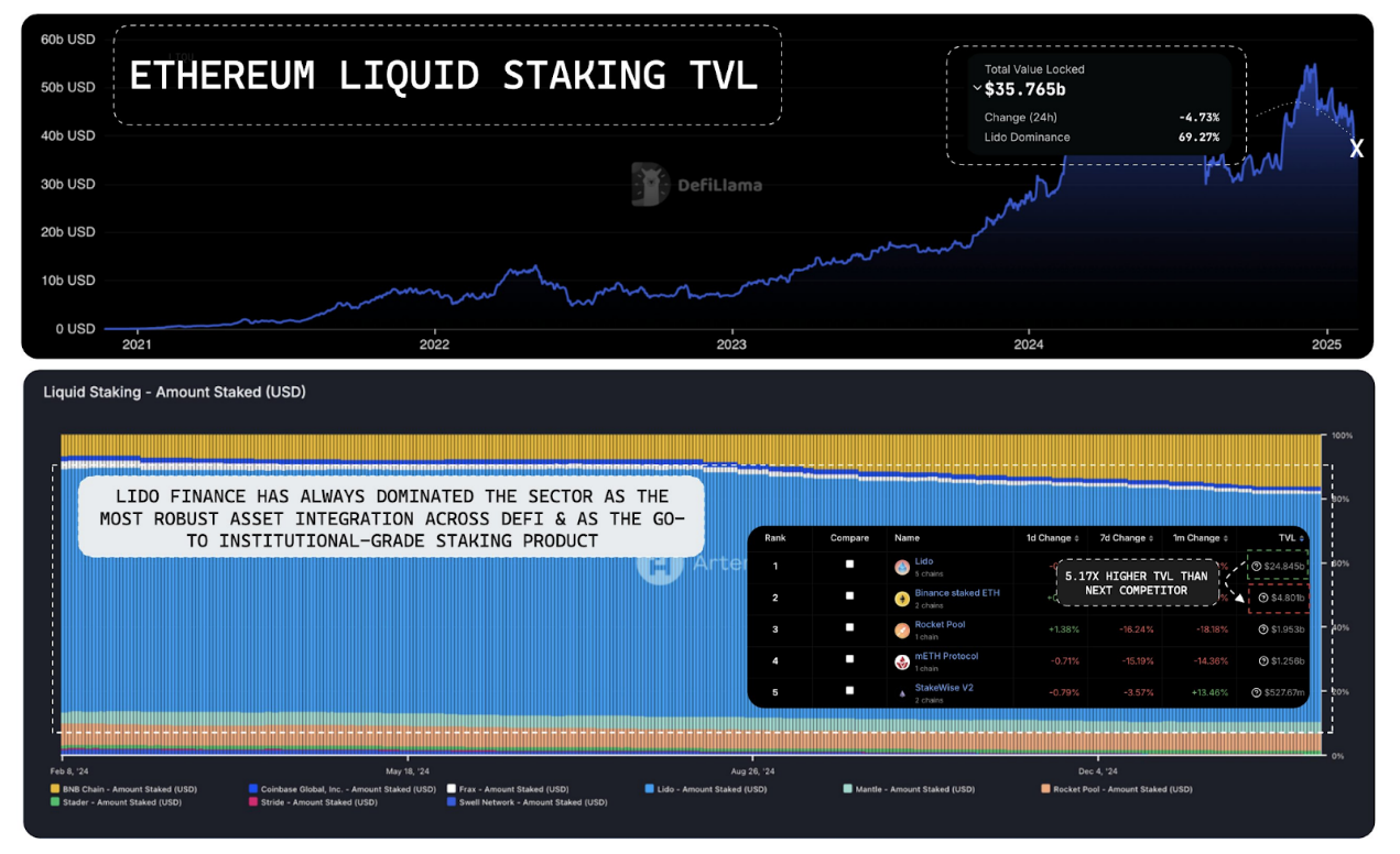 流动性质押(LST)是DeFi中规模最大的领域,TVL约350亿美元。Lido Finance占据约70%的市场份额,几乎垄断了该领域,其TVL是竞争对手Binance bETH的5.17倍。