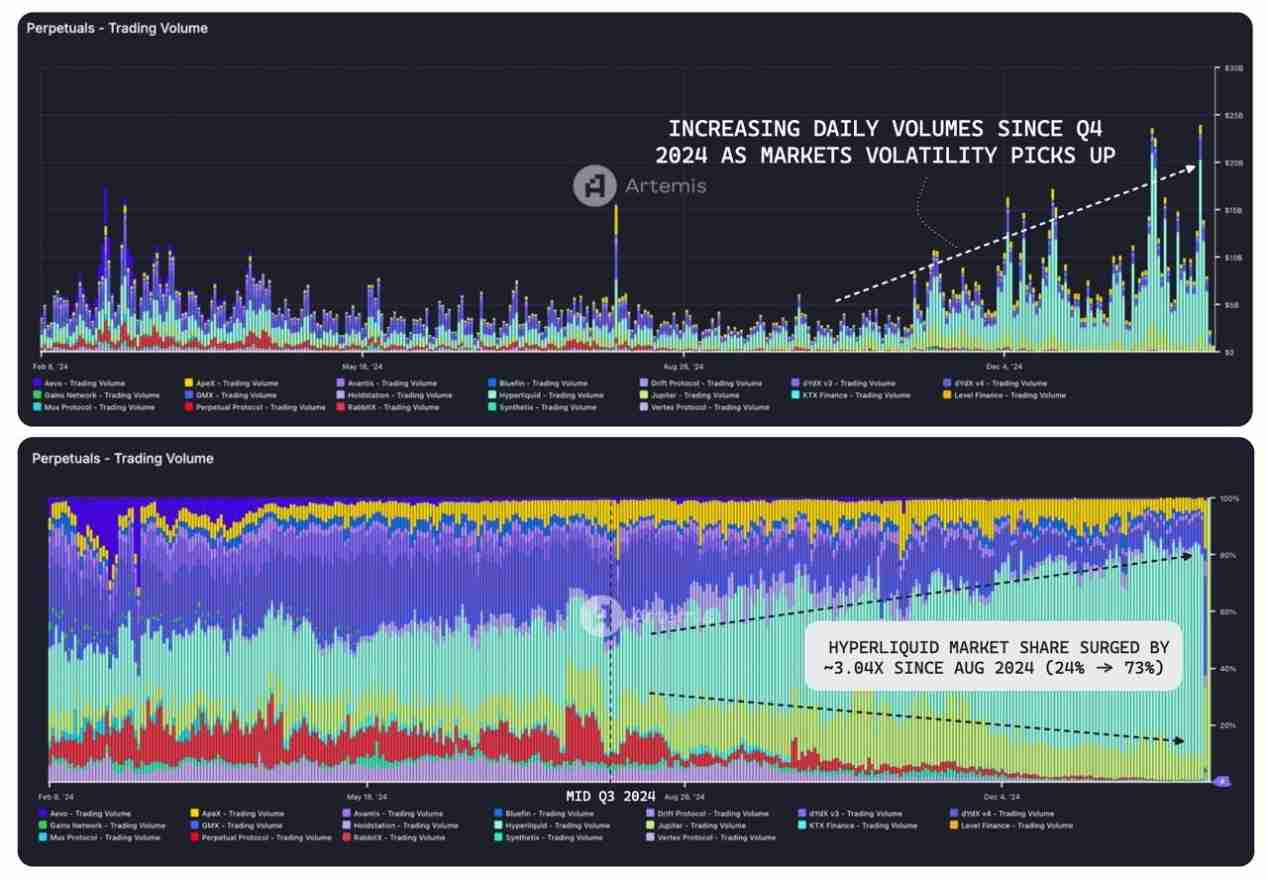永续合约DEX领域,Hyperliquid占据主导地位,自2024年第三季度以来市场份额从24%增长至73%。永续合约DEX的整体交易量也在回升,日交易量已达约80亿美元。Hyperliquid正挑战中心化交易所(CEX)的价格发现平台地位。
