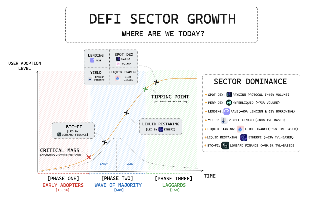 DeFi的核心在于提供更具创新性和效率的金融系统,通过验证的市场契合点(PMF)解决TradFi的低效率问题。 DeFi由多个关键领域构成,这些领域普遍呈现寡头垄断的市场结构。