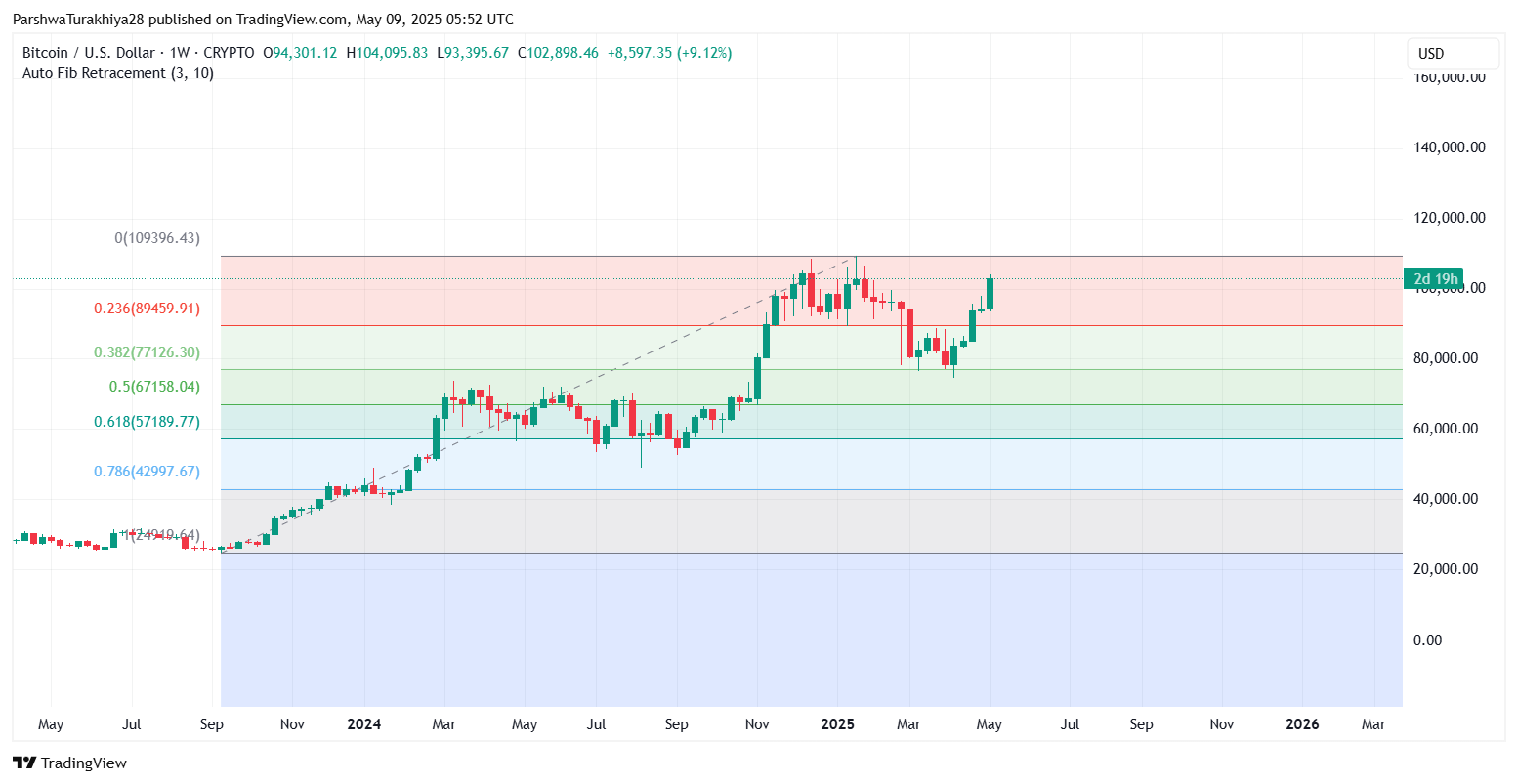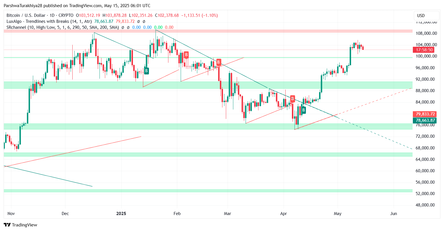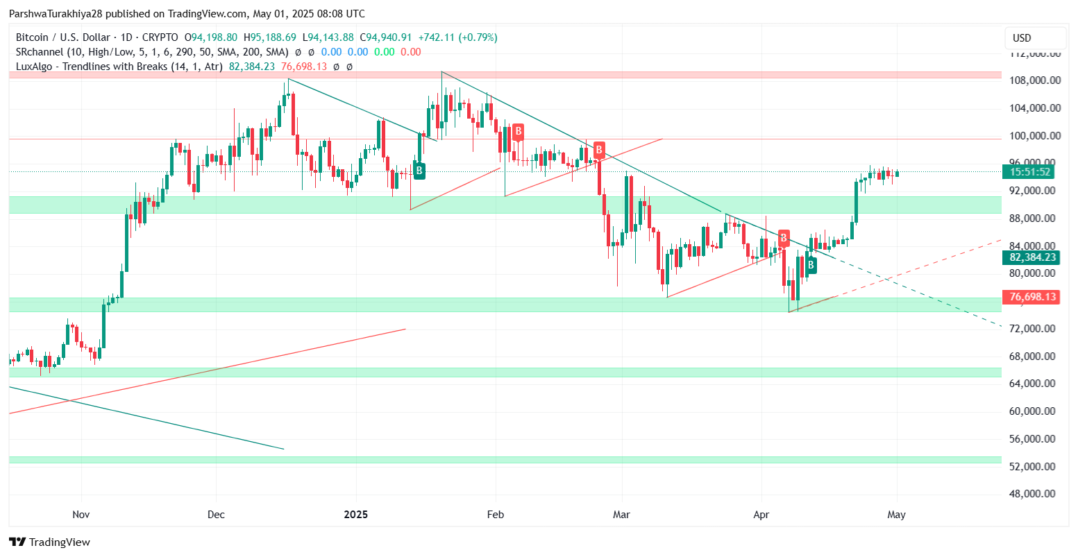 - 2025 年 5 月比特币 (BTC) 价格预测:BTC 能否突破 10 万美元或面临阻力?
