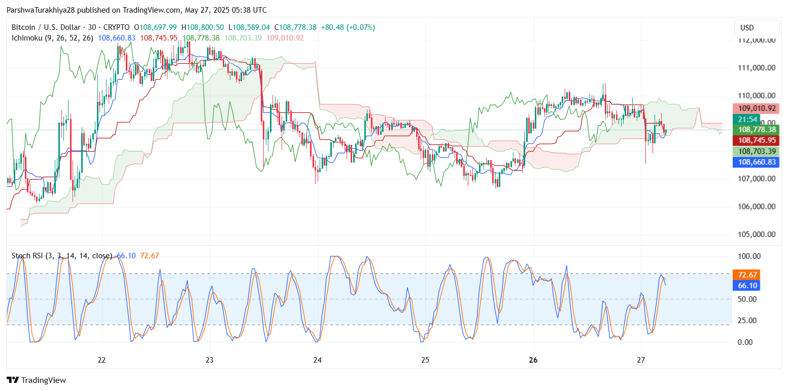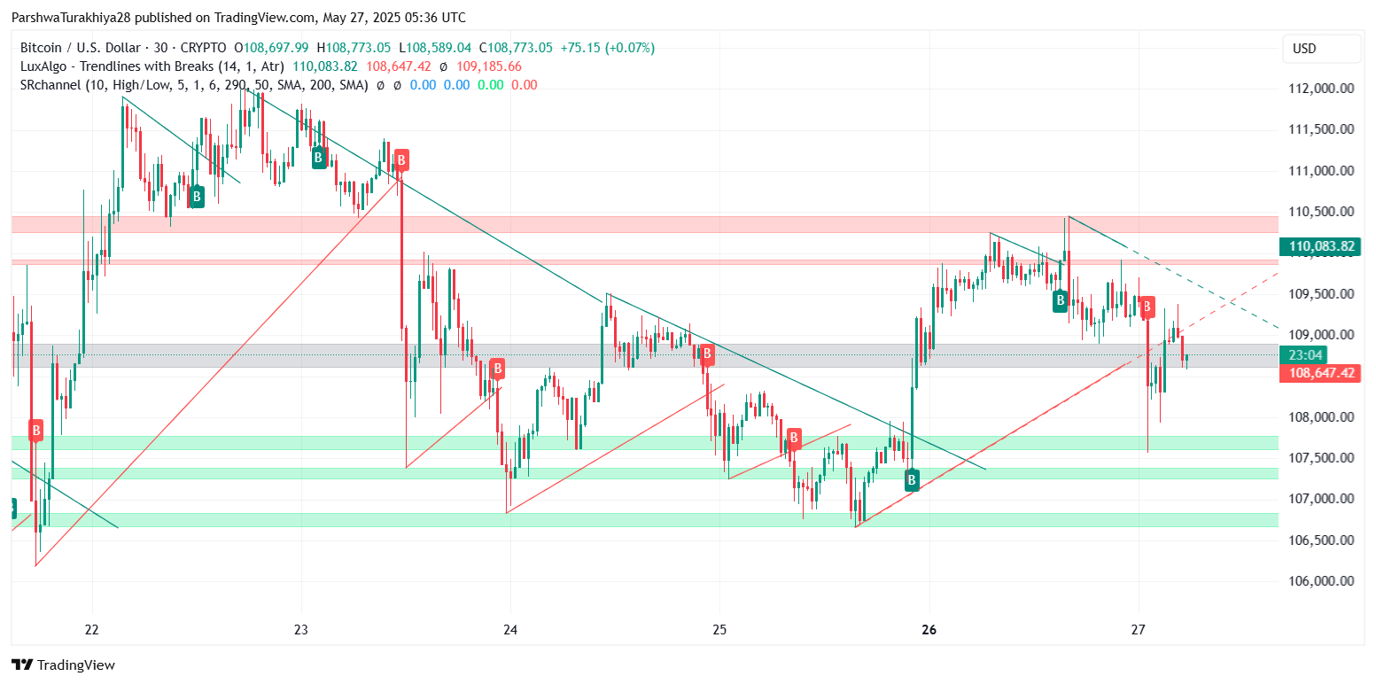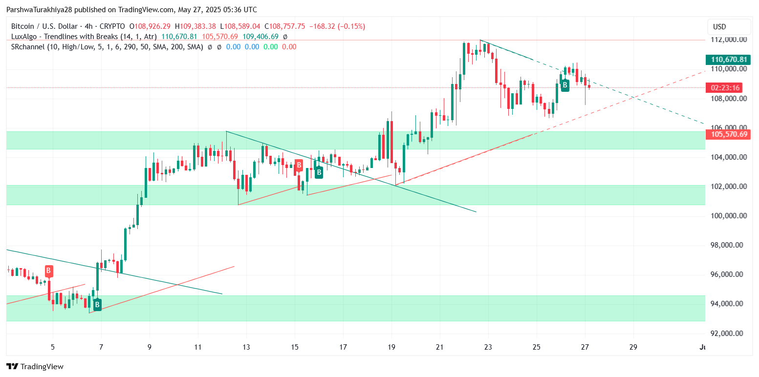 4小时图上,比特币近期突破了上升楔形形态,目前正在测试对称三角形结构的下边界,支撑位在108,000美元附近,阻力位在110,600美元附近。此次回调是继5月20日以来的强劲反弹之后出现的,在此期间,比特币价格在五天内飙升了近12%。然而,未能守住楔形顶部,并随后在110,500美元附近受阻,表明近期市场已出现疲态。