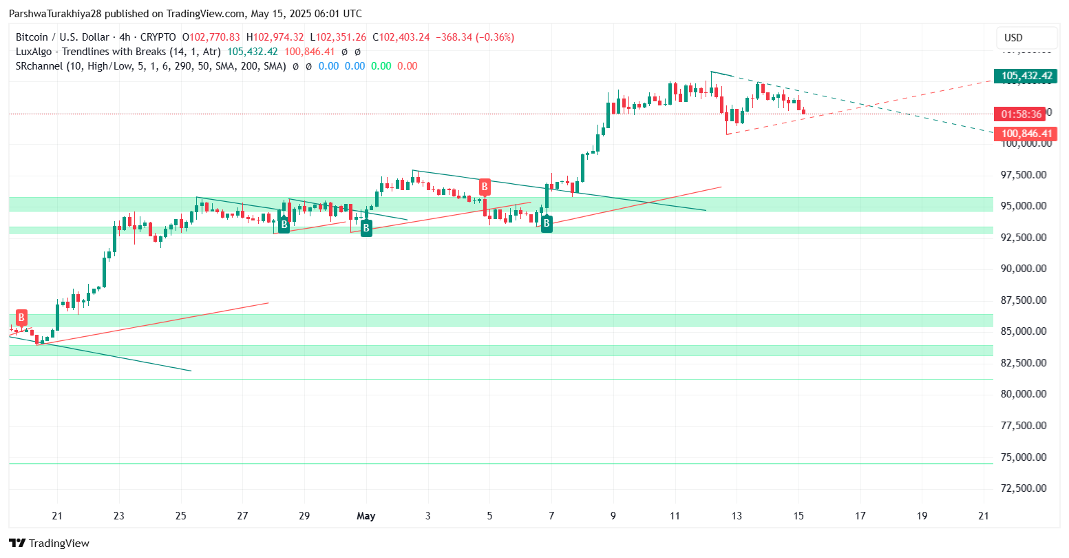 比特币当前的行情是在强势突破9.5万至10万美元区间后出现的,买家在该区间建立了稳固的基础。但随着价格目前跌破短期三角形阻力位,动能似乎正在减弱,并进入盘整阶段。问题是,比特币价格今日为何下跌?这究竟是更大范围回调的开始,还是持续上涨前的一次健康调整?