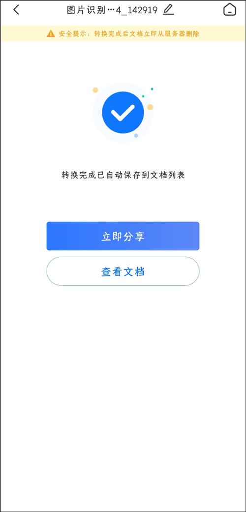 第五步:完成后,可以点击“立即分享”,将word文档发送到其他设备或者他人,点击查看文档,第一时间看到图片转word后的样式。