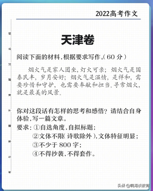 北京卷与天津卷考试人数少,两市加起来才10万考生多一点,他们的作文题一般引起的关注比较少。北京卷分微作文和大作文。我感觉微作文的题材更好一点,大作文的题目这么说有点俗套的意识,比较传统类型的作文。考生一般可以写的,精彩难!天津的是主旋律作文,写起来不难,也是拿高分难。