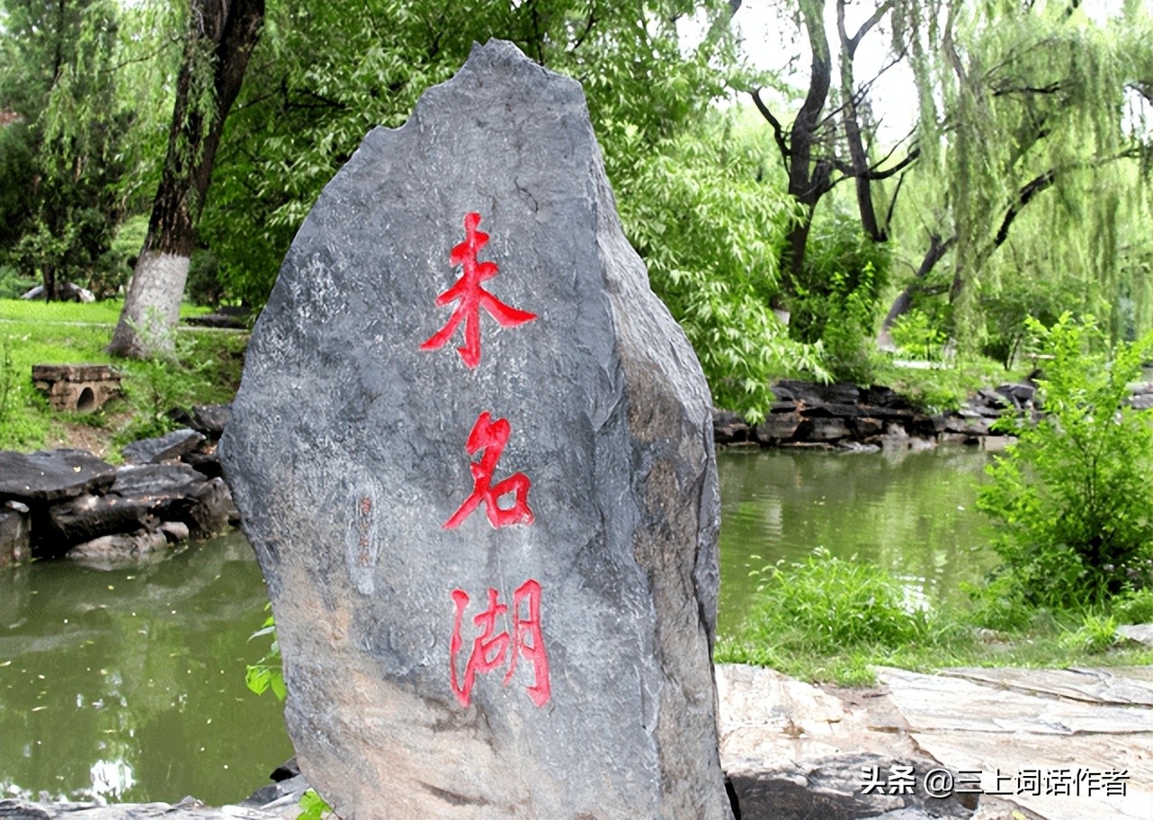 想当年,携书剑,未名湖,溶溶漾漾,有留影悄悄燕高。记石约,水草地,满塘生,清清爽爽,安名缰利锁套牢。欲传呼,不重问,恰逢处,菶菶萋萋,有长子维行踏谣。