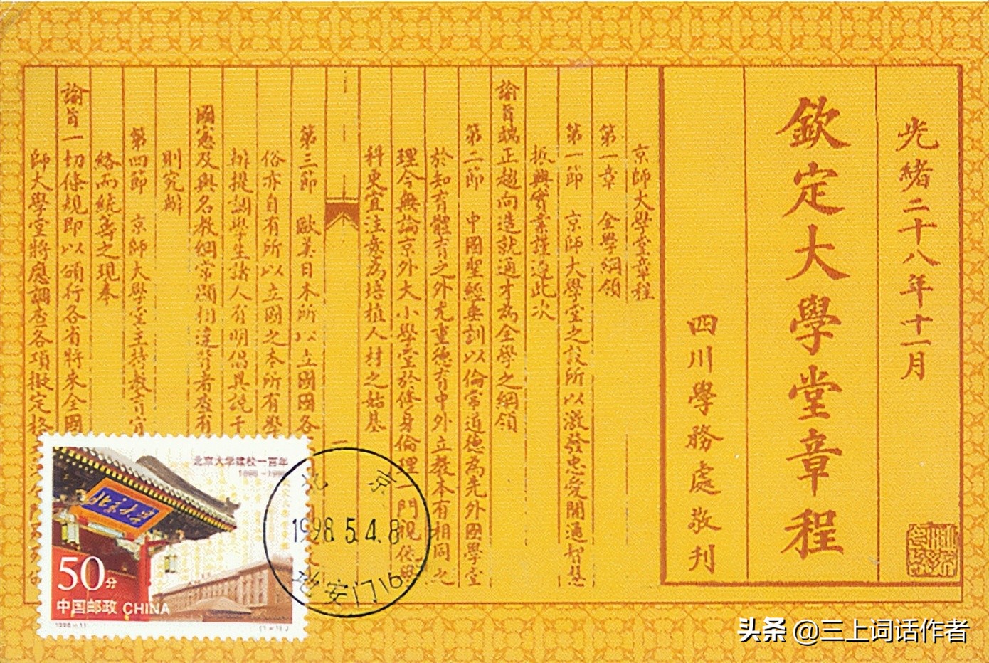 于是壬子孟夏,【即1912年5月15日(农历三月廿九)。】北京大学冠名而国立,【称谓,即国立北京大学。】听蒸汽笛鸣催发,【蒸汽笛鸣:火车的诞生和施用。1804年,由英国的矿山技师德里维斯克利用瓦特的蒸汽机造出了世界上第一台蒸汽机车,时速为5至6公里。因为当时使用煤炭或木柴做燃料,所以人们都叫它“火车”,于是一直沿用至今。催发:比喻词。催促出发。[宋]柳永《雨霖铃》词:“都门帐饮无绪,留恋处、兰舟催发。”】戒醉骑逍遥之类。【戒:《说文解字·廾部》:“戒,警也。”《荀子·儒效》:“家富而愈俭,胜敌而愈戒。”这里指改变旧习。醉骑逍遥之类:诸如改变乘用牛车、羊车等习惯。比喻摒弃落后的东西。】倡研究高深学问,【蔡元培先生在就任北京大学校长时发表就职演说时, 讲述大学精神之一为“抱定宗旨”。指出大学的性质“大学者,研究高深学问也。”】做科学救国之事。【中国近代科学的奠基人之一,著名学者、教育家和思想家任鸿隽曾提出“科学救国之事”的话,亦可谓是“科学救国”的先驱。】“循思想自由原则,取兼容并包之义”。【教育家蔡元培先生提出的学术主张和办学方针,强调不论何种学派,“苟其言之成理,持之有故,尚不达自然淘汰之命运者,虽彼此相反,而悉听其自由发展。”(《致“公言报”函并附答林琴南君函》) [引证]所谓寸有所长,尺有所短。“思想自由”是挖掘潜力和启迪智慧的思维方式,“兼容并包”是兼纳和开明的行为做法。关键是稀罕长(cháng)者,长(zhǎng)者包容,凡有所望,我必育之;凡有所长,我必用之;凡有作为,我必有之。】开选科以文理,【文理:即所实行的一种教育制度,即将教学分为文科和理科,采取分别教育的方式。】分学科于专精;【按照学问的性质,依据学术的性质而划分的科学门类,精通所学科目。】尊格物以致知,【格物致知:“物格而后知至,知至而后意诚,意诚而后心正,心正而后身修,身修而后家齐,家齐而后国治,国治而后天下平。”([西汉]戴圣《礼记·大学》)后人由“致知在格物,物格而后知至”引申出成语“格物致知”。格:推究;致:求得。穷究事物原理,从而获得知识。[引证] 格物致知,指的是一种实践精神,从而证明的是一种学贵力行,行贵体悟,行而致知,知而促行,循序渐进,方能诚意正心。只有培育修齐治平品格,才能造就经世致用人才。】悟知来于忽焉。【知来:“见出以知入,观往以知来。”(《列子·说符》)即看见外表就可以知道内里,观察过往就可以预知未来。忽焉:快速貌。《论语》:“颜渊喟然叹曰:‘仰之弥高,钻之弥坚,瞻之在前,忽焉在后。’”[引证] 没有无缘无故的天之骄子,只有充分准备的厚积薄发。】妙万物以达观,【达观:泛指畅通,谓心胸开朗,见解通达。出自《尚书·召诰》:“ 周公朝至于洛 ,则达观于新邑营。” [晋]陆云《愁霖赋》:“考幽明于人神兮,妙万物以达观。” [引证]此偏向遍览、纵观之意多矣。《魏书·阳尼传》:“彼八方之局促兮,殊无可以达观。”】纵浪大于化中;【[晋]陶渊明《形影神三首》之“神释”:“纵浪大化中,不喜亦不惧。”[引证]顺应自然,以达观的态度看待一切事物变化。】秉道法以自然,通大道于方圆。【道法自然是老子学说的精髓,出自《道德经》第二十五章:“人法地,地法天,天法道,道法自然。”故与“通大道于方圆”句,联系起来理解,方可通达。《管子·形势解》:“以规矩为方圜则成,以尺寸量长短则得。” [引证]方圆是事物的形体、性状,行为和规范是处世之道与做人之本。】涉四海以潮涌,踩坚船于属意;【跨海洋时记坚船的厉害,即鸦片战争,1840年(道光二十年),英国政府以林则徐的虎门销烟等为借口,决定派出远征军侵华。[引证]属意:意向集中或倾向于某人或某事。踩坚船于属意:泛指踩上坚船出海时,时刻想着有着属于我们同样的坚船,于是才有为中华民族而读书的决心。】告八荒以奋蹄,晓利炮于国安。【教化民众,启发自觉,国力不强,军力不强,就会被动挨打。牢记1840年,船坚炮利的英国海军沿着广州一路北上,打到天津,经过多次的交火和清政府的懦弱协商,中英签订《南京条约》。[引证] 说明“告八荒以奋蹄”的迫切与及时。八荒:泛指周围、各地。四面八方遥远的地方,犹称“天下”。如《汉书·项籍传赞》:“并吞八荒之心。”颜师古注:“八荒,八方荒忽极远之地也。” 晓利炮于国安:指读书为国强,时刻准备着催告有着属于自己的利炮,才能拒敌于千里之外。】取法典于启智,寓法理以通义;【喻京师大学堂首设“法律学门”,开中国近现代大学法律专门教育之先河,启蒙法治思想。法理:法律的理论依据。《东观汉记·张禹传》:“明帝以其明达法理,有张释之风,超迁非次,拜廷尉。”又《隋书·裴蕴传》:“蕴亦机辩,所论法理,言若悬河,或重或轻,皆由其口,剖析明敏,时人不能致诘。”又,李大钊《国情》:“以新约法为物,无吾侪管窥法理之馀地。”通义:释义为普遍适用的义理;疏通大义。《孟子·滕文公上》:“治于人者食人,治人者食于人,天下之通义也。”又《汉书·卷三十六·楚元王刘交传》:“天地之常经,古今之通义也。”】信辣手以著文,担道义于铁肩。【明代大臣杨继盛有“铁肩担道义,辣手著文章”联句。李大钊有“铁肩担道义,妙手著文章”语。[引证]“道义”是义理;“妙手”是方法;“文章”是立说;