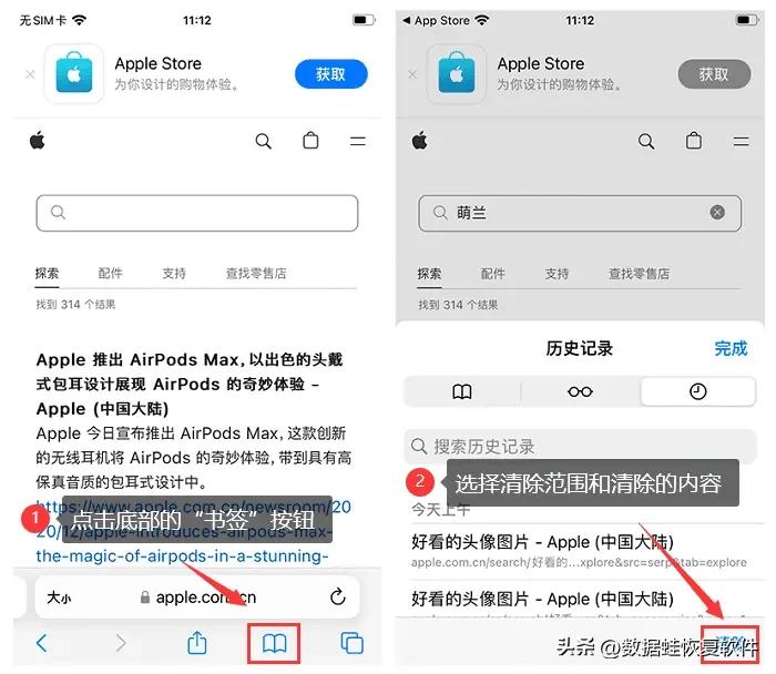 打开Safari浏览器,点击底部的【书签】按钮,选择清除范围和清除的内容,在历史记录页面中选择【清除】。