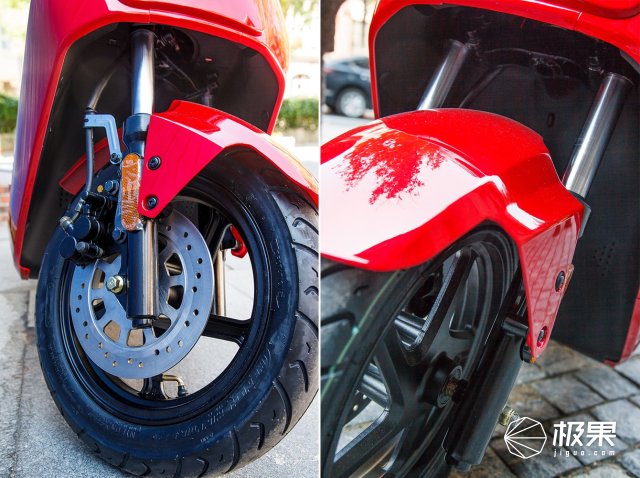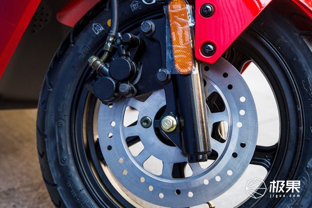 N1S都市版前后轮胎为90/90-12的真空胎,刹车与N1一样采用的是碟刹结构,前制动是220MM的双活塞液压碟刹,后制动是180MM双活塞液压碟刹。