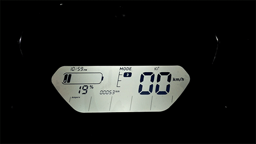 后面的骑行全程是2档都市模式,中控一直显示ECO最佳能耗状态,在晚上10:59分的时候电量掉到20%以下,此时中控会出现低电量提示。看了眼公里数是53km减去之前的5km,从100%电量到19%的电量一共行驶了48km。 电量在15%的时候会限制在1档20km/h上下,预估里程还可以跑10km左右。经过一天的混合模式(2档~3档)的骑行小牛N1S都市版的续航可以维持在60公里左右。这是比较平稳的骑行没有突然加速减速情况下的续航。与小牛实验室中N1S都市版标准电池包的80km的续航还是有一定的差距的。而且实际生活中因为不同驾驶者的骑行习惯续航还会有所不同。另外就是,如果电池放在车辆中一晚上还会有2%左右的电量损耗。