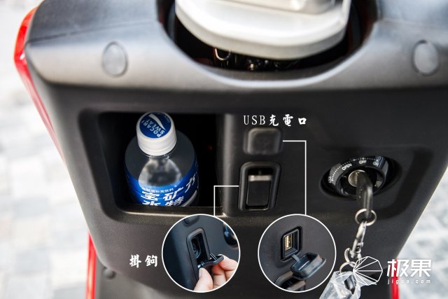 车身的杂物格可以轻松放下一瓶500ML的饮料,上面还富裕很大空间,平时放个手套杂物手机什么的还是非常方便的,右侧的挂钩也可以挂个随身小包或者来套煎饼果子,因为是塑料件所以强度不会很高,不要挂太重的东西。上方的USB充电接口可以给手机充电,也就是说有小牛在的时候就不用担心手机没电了。