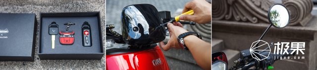 在座筒和电池仓随车附带了后视镜、挡风板还有天猫合作款的备用钥匙。