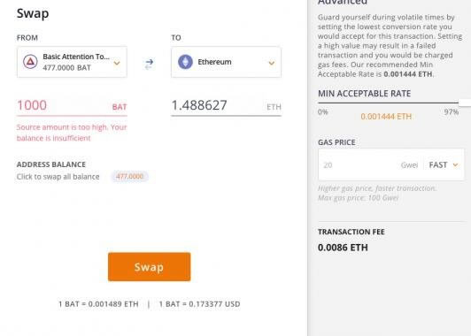 交易界面如下,选择要交易的代币,输入数量后会直接计算出一个报价,例如卖出1个BAT可以换取0.001492 ETH。