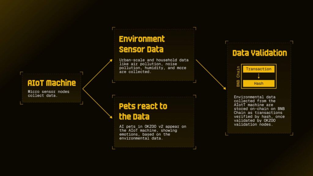 与传统的物联网设备仅仅收集数据不同,币安ZOO的AIoT机器配备了根据收集的环境数据展示情感和行为的AI伙伴。如果湿度、空气质量和噪声水平等条件最佳,宠物就会表现得快乐和舒适;而当指标恶化时,宠物则会表现出不适或痛苦。这种视觉反馈机制使得环境意识直观且吸引人。