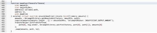 链上所有的应用程序(dApp)也都是由智能合约驱动的,不论是借贷协议、去中心化交易所(DEX)、预言机或NFT 市场。这些协议都是由一个或多个智能合约组成的,而合约里面都会写好各式功能,让协议能正常被用户使用。例如我们刚刚举例的“Swap Exact TGate.ions for TGate.ions” 功能,就能在下图合约上看到当用户地址呼叫这个功能时,合约会做什么相对应的操作。