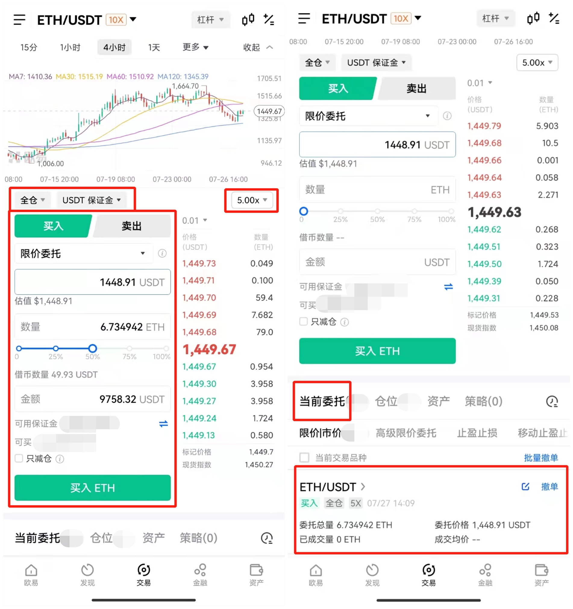进入ETH/USDT杠杆交易页面,选择买入,选择全仓/逐仓模式,选择委托类型、保证金类型(USDT保证金)、杠杆倍数、交易价格,交易数量/金额,点击「买入ETH」按钮即可下单成功。挂单成交后,即可在仓位界面查看持仓相关数据,仓位可通过止盈止损、平仓、市价全平三种方式平仓。