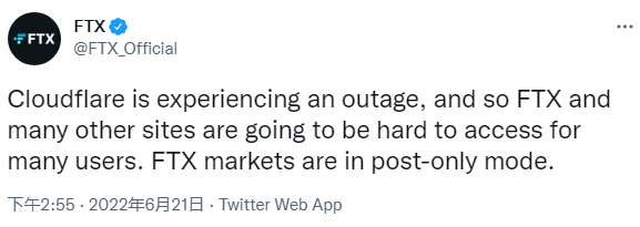 @FTX_Official 官网推特账号也发文称,这家业内第二大加密货币交易平台在服务宕机时变得无法访问,且曾短暂进入过“post-only”的交易模式。