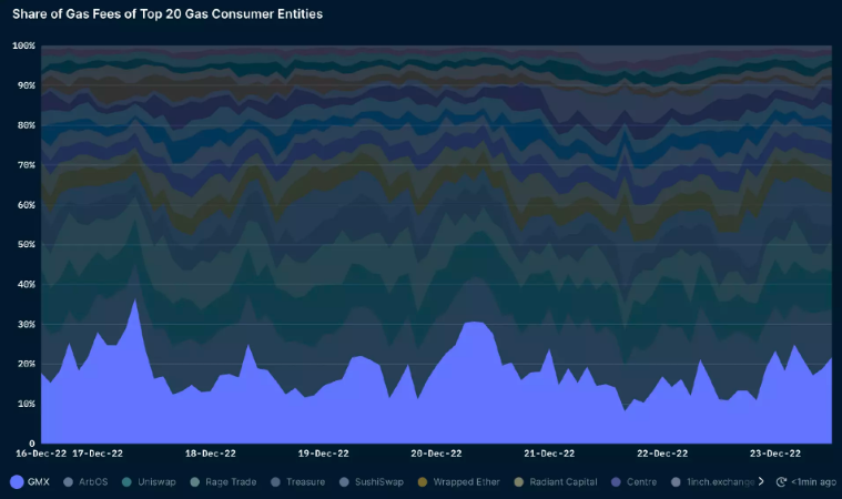 当前,GMX 的总锁定价值(TVL)为 4.15 亿美元。而据 Nansen 的 Gas Tracker 数据显示,在 Gas 消耗中 GMX 稳稳占据第一名。因此,Arbitrum 也出现了一个有趣的现象——DeFi 创新爆发式出现,大多数 DeFi 创新集中围绕 GMX 展开。