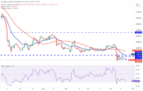 比特币仍处于下降趋势。空头在11月21日将价格拉低至16,229美元的直接支撑位以下,这表明多头的需求不足。