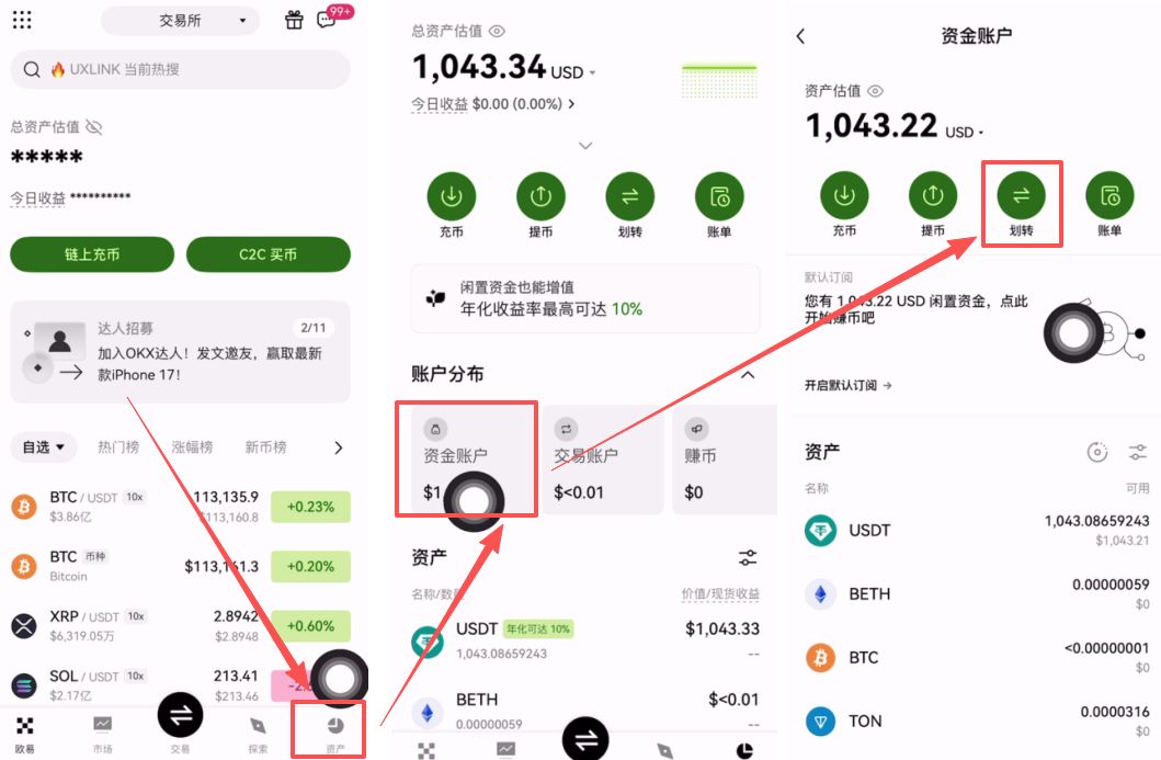 我们买好的USDT都会在资金账户里面,我们点击右下角的【资产】,然后在上方我们点击【资金账户】,之后点击【划转】。