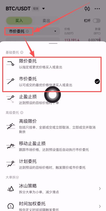 这里有限价委托和市价委托。“限价委托”就是我们可以来设置一个价格,当达到那个价格的时候才能够成交,当然这个是需要我们去等的。如果你不想等就选择“市价委托”,它会以当前最优惠的价格直接买入或者是卖出。