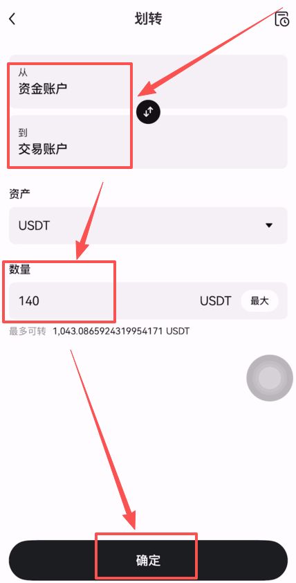 我们需要将我们的钱从资金账户划转到交易账户才可以去兑换,在下方输入一下金额,我们刚才可以算出来1000人民币是大概可以购买到140颗USDT的,这里我就直接划转到140颗,点击【确认】。
