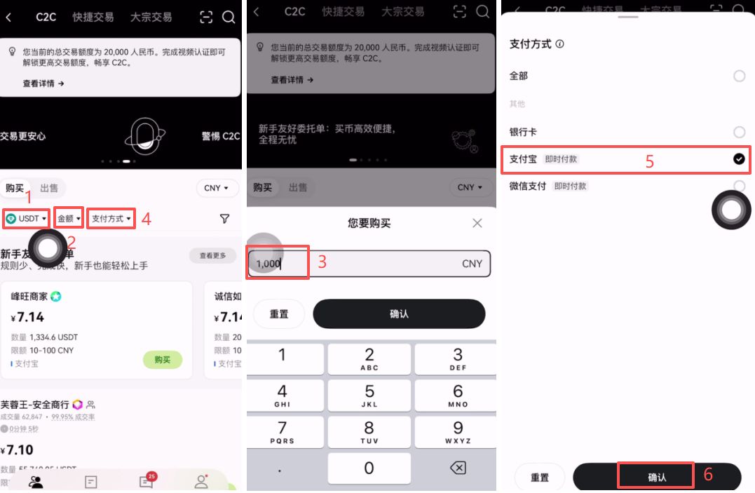 我们先去购买USDT,然后用USDT去兑换比特币,这样会更划算一些。在这里你可以输入要购买的金额,比如说我们就输入1000。后面你可以勾选一下支付方式,分别有银行卡、支付宝还有微信,你习惯使用哪种方式支付就使用哪种方式支付,我们勾选支付宝,点击【确认】。