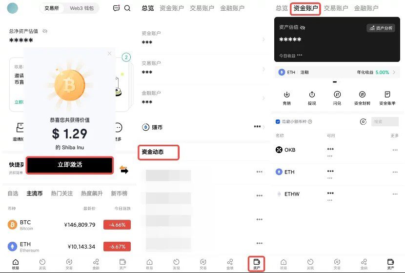 3、打开欧意APP,在弹窗中点击【立即激活】。红包激活后,可点击【查看资产】。在资金动态下可以看到您领取的红包,也可在【资金账户】下查看您的净资产估值和持有币种。