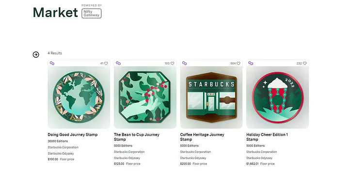 邮戳 NFT 可以在星巴克自己的市场上交易。为了改善用户体验,该市场提供了入口服务,并设计了后端处理了 Gas 费用。用户可以在不需要了解区块链的情况下使用它。