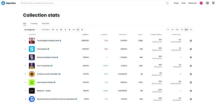 OpenSea 是以太坊上的代表性市场,支持多条链。目前,它在 Polygon 上的交易量最高。交易量高的流行项目包括:Trump cards、The Sandbox 和 MocaVerse。