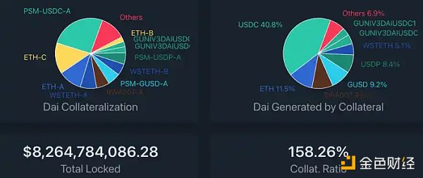 MakerDAO 协议内现在锁定的抵押品价值为 82 亿美元,单币资产(非 LP T抹茶en 、非 RWA 资产)价值为 66 亿美元。$DAI 总供应为 52 亿枚,其中由 $USDC 质押产生的 $DAI 达到 40 亿,以这个数值来看,即使仅 PSM 放出 1/4 的 $USDC 就能达到 Aave 如今的 TVL。