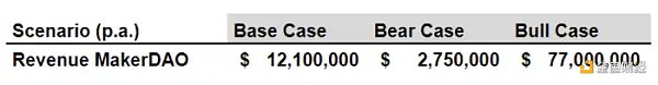 在 2022 年 6 月,MakerDAO 联合创始人 Rune Christensen 公布的数据显示:MakerDAO 稳定费年度收入约为 5,140 万美元,但是要维护这个协议所需消耗为 6,090 万美元,其中包括 4,360 万美元的现金流以及以 $DAI 计价的 1,730 美元的 $MKR,成本支出已经超过协议收入,致使协议亏损约 940 万美元。