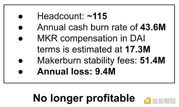 MakerDAO 协议当前收支分析MakerDAO 目前成本超过 4000 万美元/年,如果不是激进的投入了 RWA 理财,项目将出现 3~4 千万的净亏损,因此有了创始人提出的开源节流的『终局计划』。