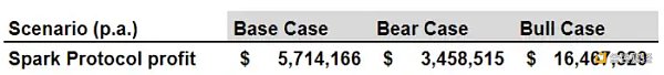 Spark 官方团队同样假定了中性、悲观、乐观三种情形下 Spark 协议的收入表现,读者可以对比参考,在 Bull Case 下预期高于我们,意味着他们乐观估计或有 50 亿 TVL,而中性、悲观的预期我们觉得相对合理: