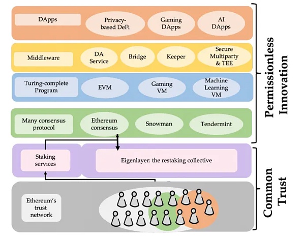 EigenLayer开创了一个无许可创新的新时代,在这个时代,创新者不需要建立自己的信任网络来实现新的分布式验证模块,而是可以依靠 ETH 再质押者通过 EigenLayer 提供的安全性和去中心化。