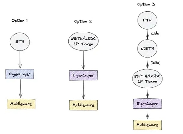 看点2:EigenLayer支持多种质押模式EigenLayer为收益堆叠提供了多种途径,允许质押者通过获得新的AVS 来赚取额外的收益。