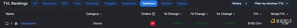 自去年 8 月 Velodrome 推出 op t抹茶en 激励措施,TVL 随之暴涨,超越 Uniswap 和 Curve,并在之后的日子里长期霸榜 OP TVL 第一。从 Defillama 的数据来看,Velodrome 目前的 TVL 约为$ 168 m,占 OP 全链的 21.6% ,无疑是 OP 上最值得关注的项目之一。