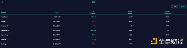 根据 Chaineye 显示,OP 上最大的 DEX 是 Velodrome,TVL 在所有 DEX 项目中遥遥领先,甚至超越第二名 Curve 一个数量级。