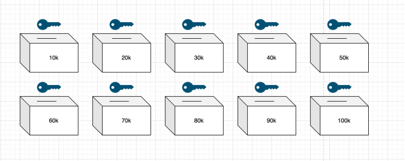 现在有十个盒子,以 1 万美元为增量,标记为 10~100k 美元。每个都有一个钥匙和一个插槽。房主带着盒子走进房间毁掉 9 把钥匙,拿走标有 40k 美元盒子的钥匙。