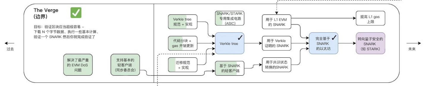 Verge 将实现「 Verkle 树」(一种数学证明)和「无状态客户端」。这些技术升级将允许用户成为网络验证者,而无需在他们的机器上存储大量数据。这也是围绕 rollup 扩容的步骤之一,前文提到过 zk rollup 的简易工作原理,聚合器提交了证明,layer 1 上的验证合约只需要验证 blob 内的 KZG 承诺和生成的证明即可。这里简单介绍一下 KZG 承诺,就是确保所有的交易都被包含了进来。因为 rollup 可以提交部分交易,生成证明,如果使用 KZG,那么所有的交易都会被确保包含进来生成证明。