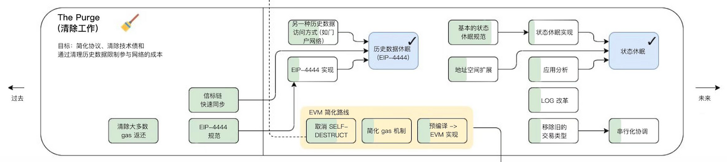 The Purge 将减少在硬盘驱动器上存储 ETH 所需的空间量,试图简化以太坊协议并且不需要节点存储历史。这样可以极大的提升网络的带宽。