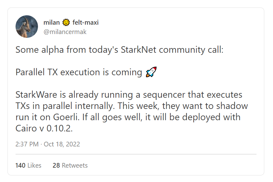 在 starknet 社区中,成员也提出了 aptos 的并行处理方式非常不错。就 Starknet 而言,目前也在推进排序器内部 tx 并行排序的能力。