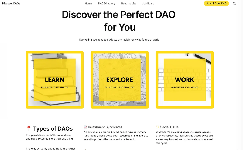 查找任何有关 DAO 的信息,并在网站上列出的众多 DAO 中发现更多新的东西。