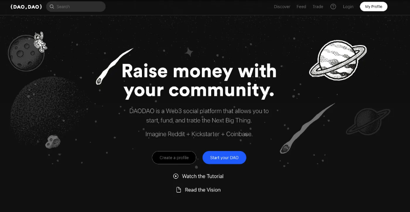 是一个 Web3 社交平台,允许你启动、资助和交易 DAO,想象一下 Reddit Kickstarter Coinbase。