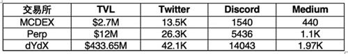 以下是三个项目的总锁仓量(TVL),各大社交媒体的订阅者或成员数量。