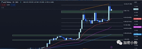 在昨天创下历史新高的80.200美元后,Ordi(ORDI)经历了一些获利回吐,导致价格回落至关键支撑区域。随着ORDI稳定在之前的阻力位上方,技术指标目前处于十字路口,未来几天可能为交易者带来机遇和风险。ORDI的价格目前正面临历史高点82.80美元的阻力,该高点是在昨天波动的交易时段内达到的。下一个目标是斐波那契-0.236延伸水平77.389美元,如果ORDI能够突破其近期高点,那将代表着下一个目标。在支撑方面,ORDI从历史高点回落后,在之前的阻力区64.341美元至68.017美元上方站稳了脚跟。