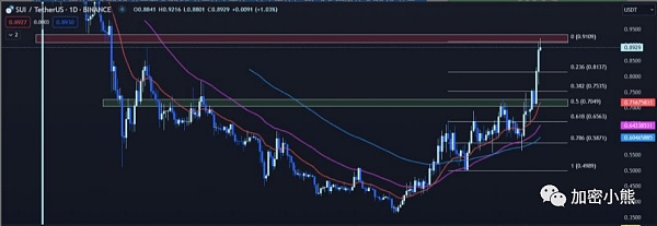 Sui Coin (SUI) 持续上涨,迎来第三天的连续涨势。尽管 SUI 价格目前在波动高位阻力附近徘徊,技术指标显示,只有在关键支撑位被突破的情况下,其上涨趋势才会受到影响。当前,SUI 价格正面临波动高点,介于0.9071美元至0.9333美元之间的阻力区域。要打破这一区域,才能迎来1.00美元测试的可能性。另一方面,初步支撑位于0.7039美元至0.7266美元水平,与Fibonacci 0.5回撤位0.7049美元相符。这一区域可视为SUI多头的道防线。RSI指标显示,SUI的当前数值为74.19,在近期上涨后进一步进入70以上的超买区域。