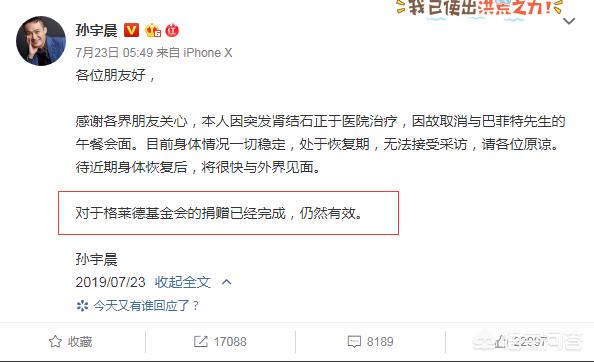 首先,动辄上百万美元,钱花了就得有效果不是,还真有不去的吗?就是有。最近一次的午餐由波场创始人孙宇晨斥资456.7888万美元拍下,却在7月23日因病取消了。下图是孙宇晨在自己的微博上发出的取消午餐声明,其中就有小伙伴儿关心的信息,午餐不去,钱照给。